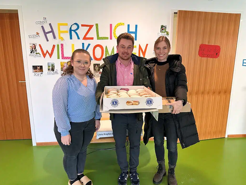 Schon zum zwei­ten Mal nutz­ten wir die wun­der­ba­re Akti­on „Krap­fen­schmaus“ des Lions-Hilfs­werks Deg­gen­dorf e.V., um sowohl mit fri­schen Krap­fen den Kin­dern der Kin­der­ta­ges­stät­te Fischer­dorf eine Freu­de zu machen als auch für den guten Zweck in der Regi­on zu spen­den. Die stell­ver­tre­ten­de Lei­tung der Kita nahm die süße Über­ra­schung von unse­rem Deg­gen­dor­fer Ver­kaufs­team­lei­ter Chris­toph Soka­cz und unse­rer Ser­vice­as­sis­tenz­lei­tung Kers­tin Roll sehr ger­ne ent­ge­gen. Der Erlös kommt die­ses Jahr der Berg­wacht, der Feu­er­wehr­ju­gend im Land­kreis Deg­gen­dorf und dem THW zugu­te.
